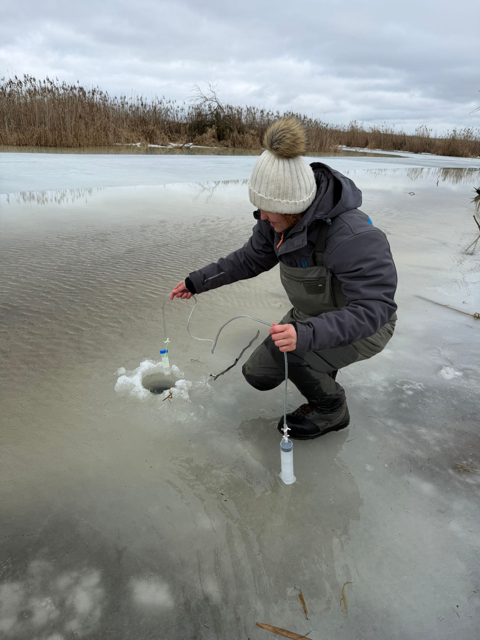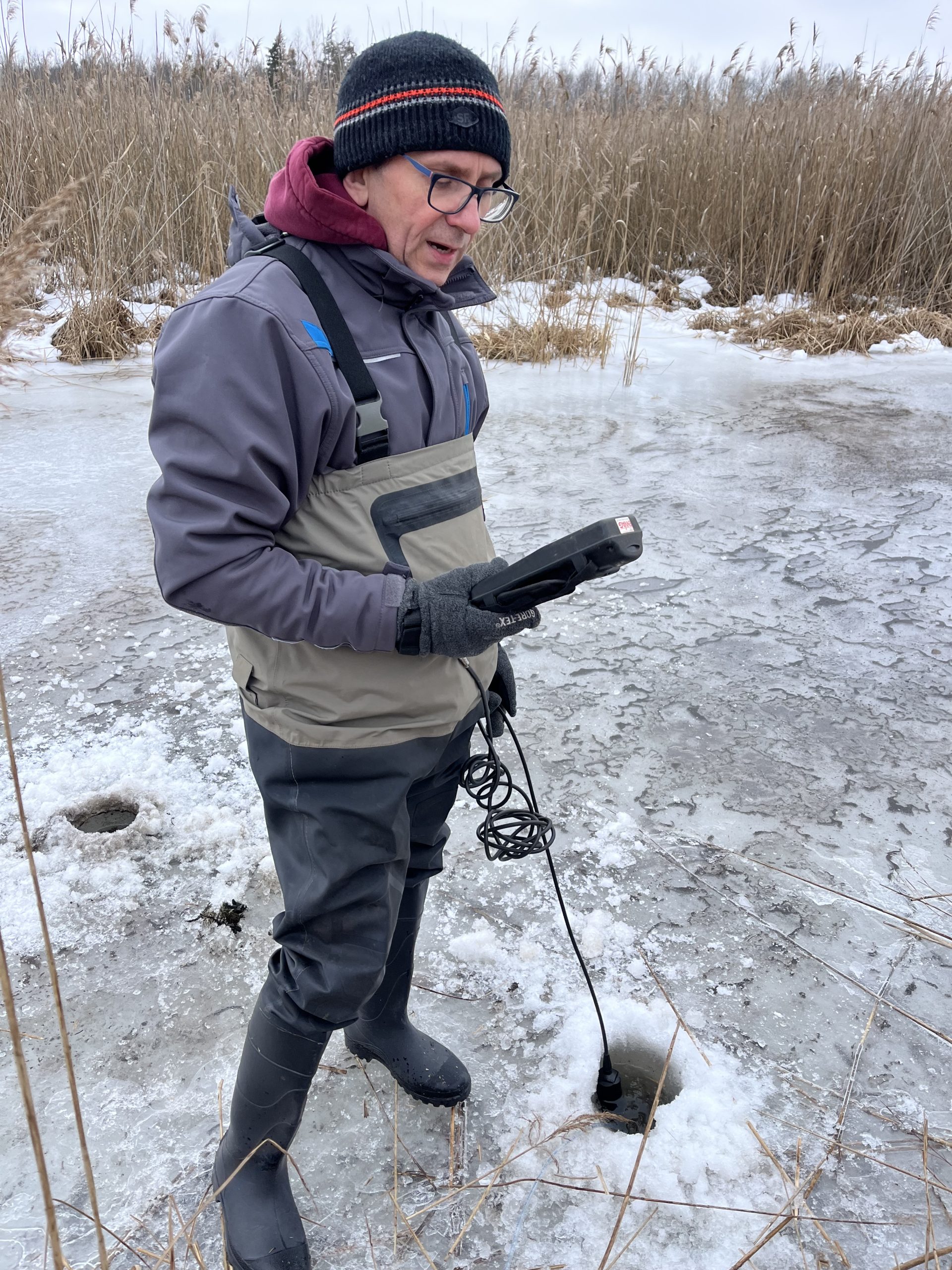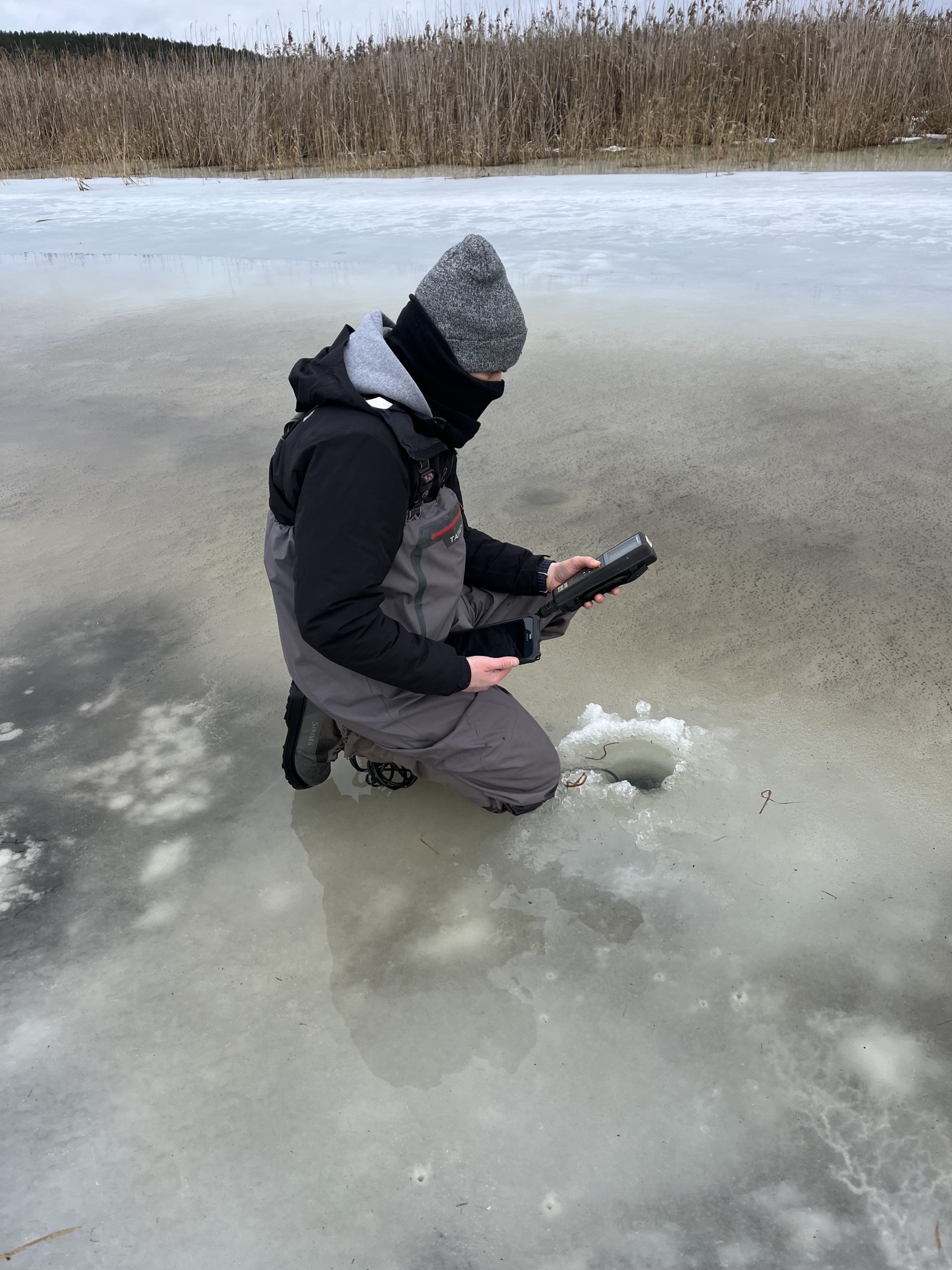 Our work focused on assessing the accumulation of carbon dioxide (CO2) and methane (CH4) during the winter period by collecting gas samples and measuring key physicochemical parameters. At some locations, ice thickness reached up to 52 cm, reflecting the intensity of this year’s winter conditions.